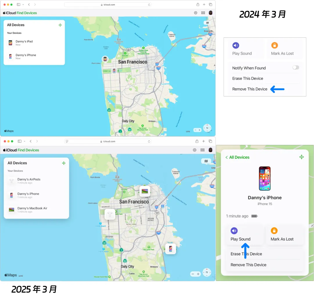 另外,不知道从什么时候开始,苹果的 iCloud 网页版也悄然发生了变化,尤其是在“查找”功能界面中,按钮设计出现了明显的改动: